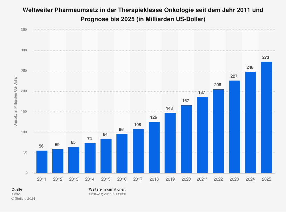 Im Jahr 2023 belief sich der Pharmaumsatz mit Krebsmedikamenten weltweit auf rund 227 Milliarden US-Dollar. “Für das Jahr 2025 wird ein Pharmaumsatz von rund 273 Milliarden US-Dollar in der Therapieklasse Onkologie prognostiziert.”